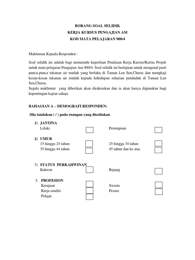 Doc Borang Soal Selidik Kerja Kursus Pengajian Am Kod Mata Pelajaran 900 4 Bahagian A Data Demografi Responden Chrys Annie Rayvious Academia Edu