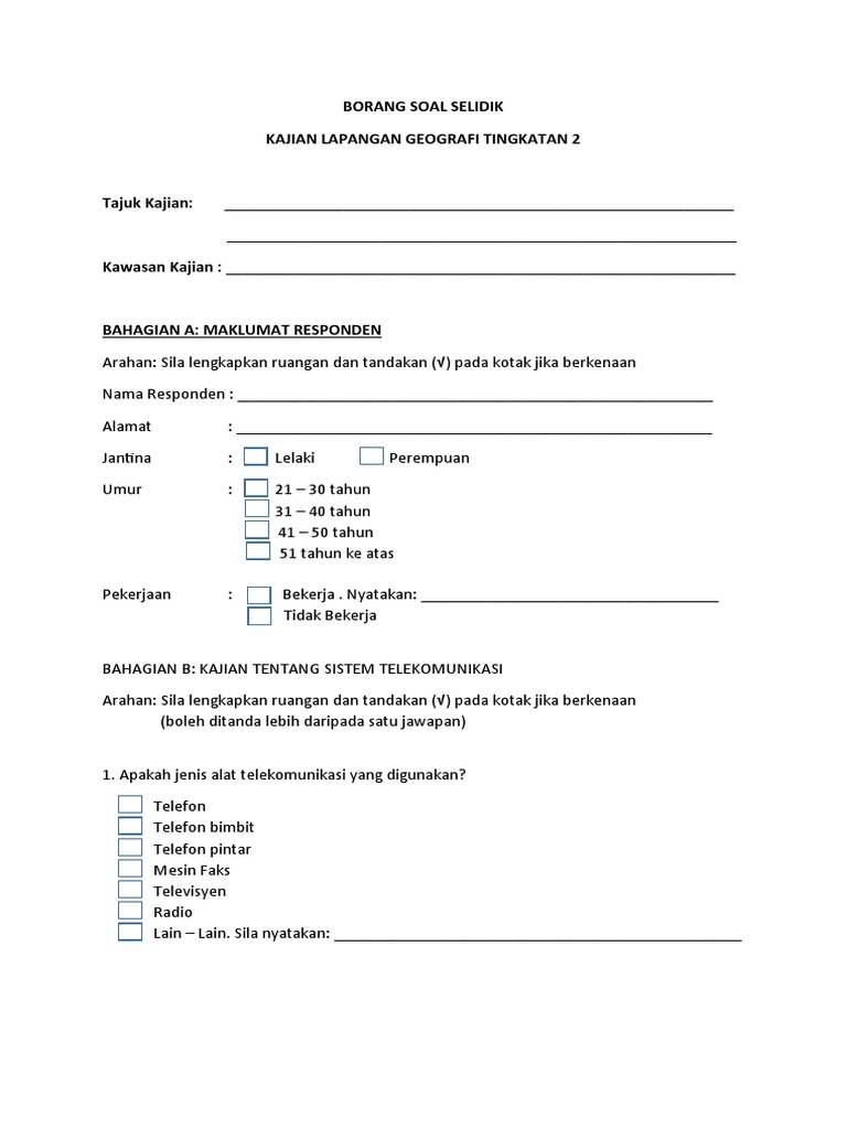 Contoh soal selidik ini boleh membantu anda mengira kepuasan sebagai kepentingan untuk tawaran perkhidmatan anda. Contoh soalan kaji selidik tentang obesiti contoh awi contoh borang soal selidik geografi 2021 tingkatan 3 preschool printables projects to. Contoh Borang Soal Selidik Geografi PT3 Tugasan 2022 bagi pelajar tingkatan 3.